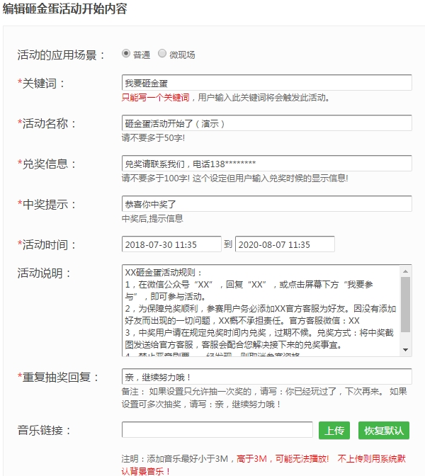 在后台的微活动中找到微信砸金蛋的模版,进行编辑完善就可以了,编辑好文字和图片,还有活动的规则和说明,砸金蛋活动还支持上传背景音乐,可以根据需要设置。