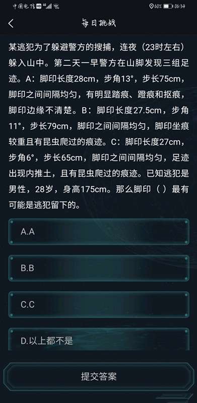 2)脚印B相对于A步角变小,步长变长,且有明显坐痕,这是大脚穿小鞋的明显特征。脚印有昆虫爬过的痕迹,说明是在前半夜留的。(24时之前)。
