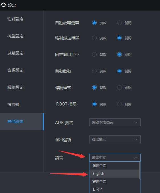 第二步:打开模拟器设置,更改成英文English后重启模拟器,一定要重启,重启,重启