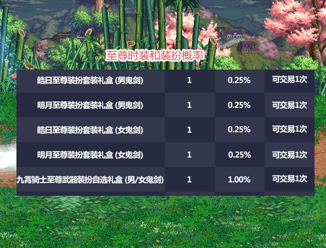 历届至尊系列道具,会安排在“多买多送”环节,这一次“梅尔文”比较出乎意料,把时装和武器装扮,弄在九霄骑士宝物神秘礼盒中!已明确告诉你,宝物神秘礼盒账号绑定,买礼包会送玩家。只是,里面涵盖的道具太多,九霄骑士至尊时装礼盒,也才0.25%的概率,武器装扮仅1%!