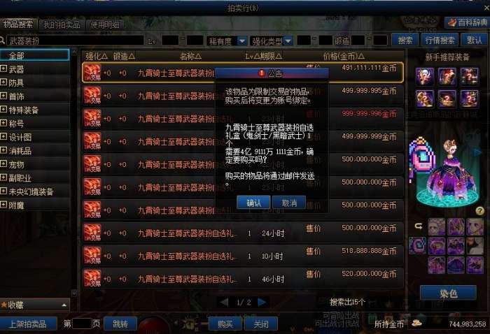 如图所示,一件至尊武器装扮自选礼盒,拍卖行5E金币左右。反观至尊时装,比武器要便宜些,但仍旧很贵,最起码2E金币才行!此次九霄骑士套,外观设计一般,至尊也没有亮点,甚至没武器装扮好看。