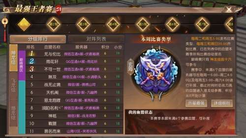 氏族联赛分为小组赛与淘汰赛,组赛一共持续三轮,每周进行一轮,每轮会进行10场比赛,比赛时间为周二至周六的21点,每天会进行两场比赛。