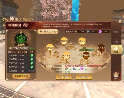 因为目前氏族领地被损毁严重,在全新的神魔之巅中(原有的天外山海改为神魔之巅)五大氏族需要再第一阶段中修复领地。