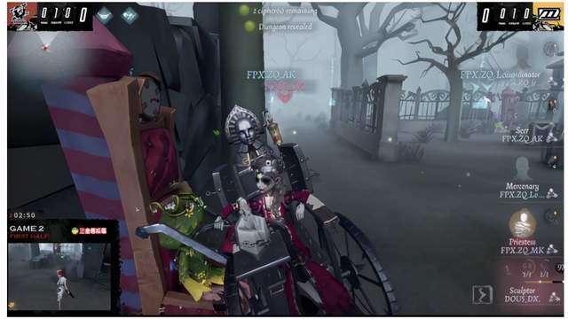 上半场FPX.ZQ战队求生者利用自家战队对红教堂的熟练度完美的打出了各种配合,让监管者没有太多机会从自家身上拿到机会最终拿到三出;下半场前期空军倒地过快并且倒在地下室,先知也没能牵制出足够的时间,开门战祭司又撞脸,但好在监管者没用底牌无法传送到小门拦截佣兵不然直接是四抓局。