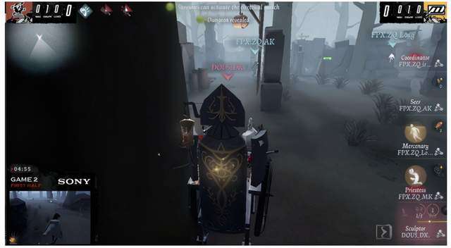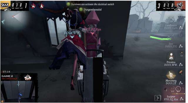 对局开始,监管者刷在大门。往墓地绕了一圈回到大门看到佣兵不打算追击,来到小房看到先知开始追击。大房先知配合祭司的洞不好追,雕刻家选择来到小门看到祭司开始追击。先知交鸟帮祭司抗掉一刀,雕刻家闪现拉近距离将祭司打成半血。