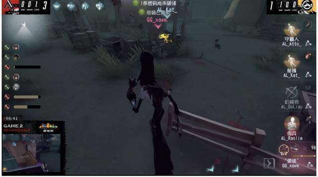 对局开始,监管者刷在海边,开局往小房走找到佣兵与守墓人,逼出佣兵一个护腕后换追守墓人,等待淬火看到机械师位置后传送大船开始追击机械师,利用猫拿到第一刀,随后再次放猫将其击倒。