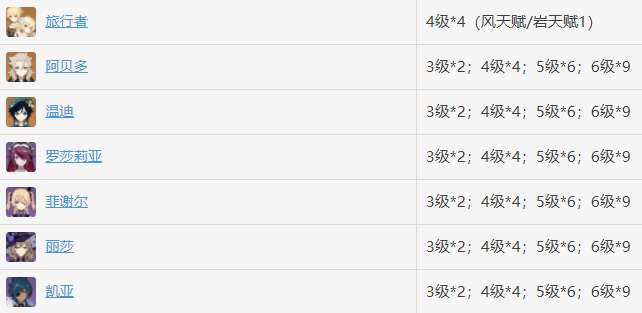 旅行者(岩)、阿贝多、温迪、罗莎莉亚、菲谢尔、丽莎、凯亚