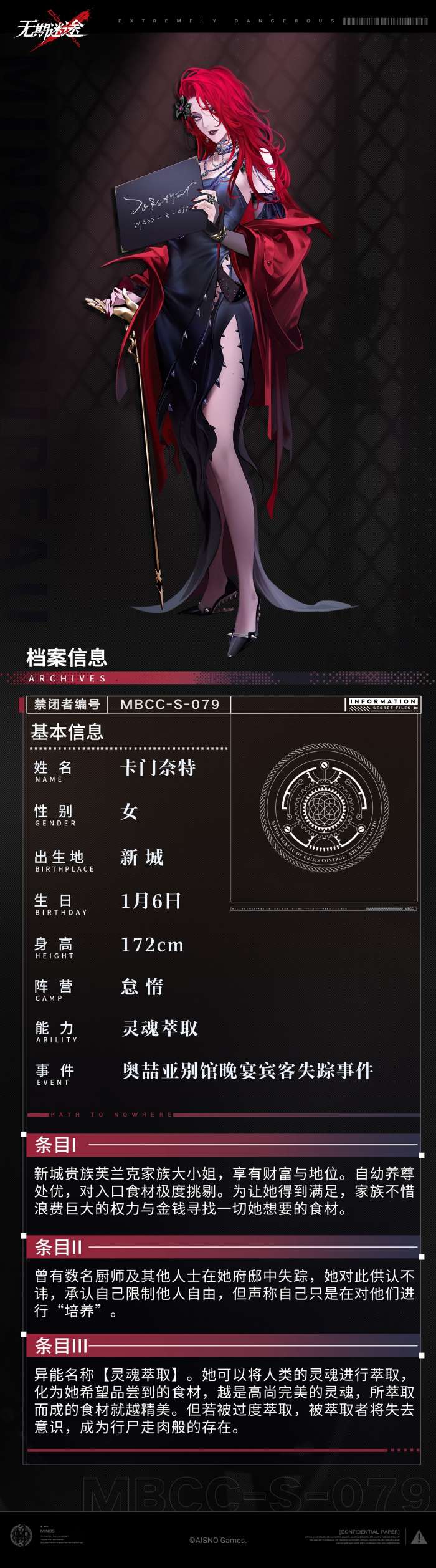 *条目III:异能名称【灵魂萃取】。她可以将人类的灵魂进行萃取,化为她希望品尝到的食材,越是高尚完美的灵魂,所萃取而成的食材就越精美。但若被过度萃取,被萃取者将失去意识,成为行尸走肉般的存在。