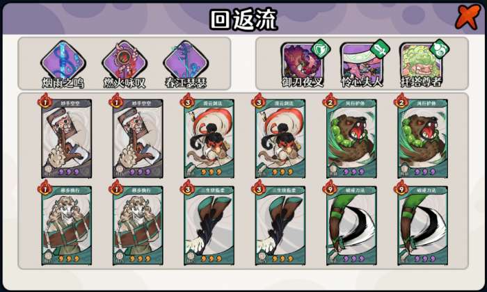 「御刀夜叉」 是十分通用的风元素豪侠,其真气技和神兵被动都是基础的防御、嘲讽类型。专属卡牌「断云刀法」可以使关键的攻击牌回手,不需要抽完牌库,是十分好用的回转手段。