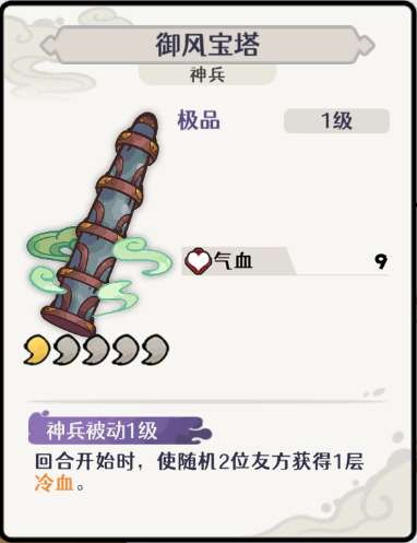 通用型悬壶,专属卡牌「青光宝塔」 很容易低怒气抽牌。神兵被动是「冷血」增伤。