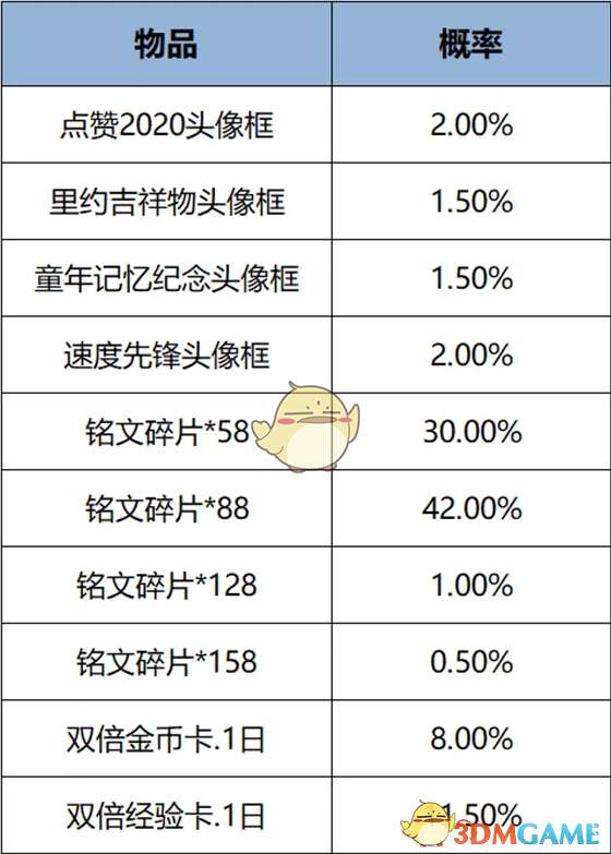 除此之外还有:双倍金币卡1日、双倍经验卡1日、铭文碎片x158/128/88/58。