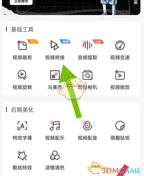 1、打开爱剪辑手机版app,点击下方“工具”按钮,再点击上方“视频拼接”功能。