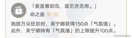 一命 1命的气氛值介于150至400层之间,增伤值提高了36%至96%。与0命相比,1命的芙宁娜少了50层(全队50%生命值变化)的叠层压力,但同时增加了100层(24%增伤)的增伤上限,对于没有群奶或枫丹角色的队伍具有一定的兼容性。然而,提升幅度有限,通病仍然存在,但是下限得到了提高,融入老体系后,初步实现了正面的提升效果。