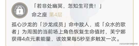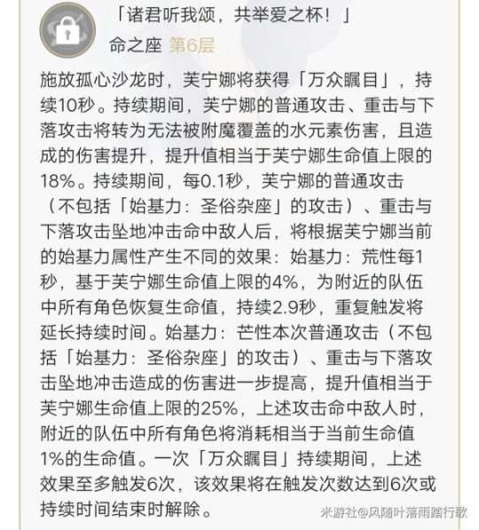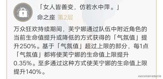 二命 芙宁娜的质变命座,它不仅可以高效地提高叠层效率,还能够显著提高芙宁娜自身的线性生命值上限。最高可以提升芙宁娜自身140%的生命上限(相当于转化为暴伤词条后的200%暴伤),大幅度提高它的增伤和召唤能力。此外,芙宁娜的二命只需要全队血量变化达到72%即可叠满层数,在队伍整体血量较低的情况下,只需要奶妈进行一次高额群奶即可直接满层。另外,后续提升生命的层数也可以达到400层,即114%的全队血量变动。
