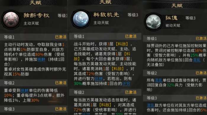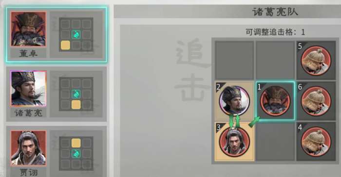 本阵容构建逻辑强调“控场优先、节奏主导”。兵种配置建议前排统一部署藤甲兵,共三名,利用其高生存特性吸收伤害,为后排输出单位争取稳定施法空间。英雄站位需精细规划:贾诩应置于诸葛亮与董卓的追击触发范围内;而董卓本身无需占据追击位,此举可确保其技能释放后,由其他角色高频触发追击效果,形成连贯控制反馈。董卓定位为开局控制发起者,其天赋技能【独断专权】可立即为我方全体降低1点统帅及1%防御,同时对敌方随机4个目标造成80%伤害,并附加1回合挑衅状态——受挑衅单位仅能锁定董卓释放技能,从而大幅削弱敌方整体输出效率与战术灵活性。