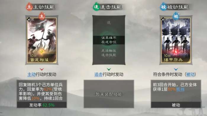 贾诩在此体系中并非主控者,而是控制链的最大受益者。当队友成功施加控制效果时,贾诩可对被控单位额外造成58%伤害;若混乱单位对其造成伤害,则可恢复自身兵力;若友军误伤贾诩,还将触发额外减益效果。其技能组合聚焦于精准收割与爆发强化:主动技能必带【兵无常势】,自动锁定敌方兵力最低单位进行打击,加速敌方减员进程;追击技能同样推荐【计谋巧变】,该技能伤害随敌方所受控制状态数量增加而提升,中后期控制叠满后可打出极高瞬时爆发;被动技能延续【兵不厌诈】,确保在控制链持续运转期间稳定提升输出权重。整套阵容的战术支点,正是董卓的【挑衅】与诸葛亮的【技穷】双控协同,构筑起难以突破的节奏壁垒。