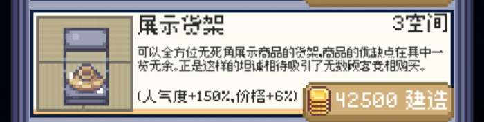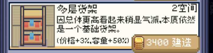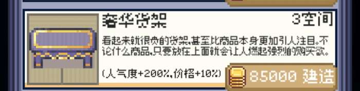 奢华货架:我玩这游戏踩最大的坑,单个升级二十次,然后发现最大上架就那点。数值高,但是不加容量,占空间大,还贵,一级不够用必须升一级,六空间约等于数值+八格货架,相比之下还是拍三个多层货架或者华丽货架比较爽吧,基于数值和最终货架的排面,给一个顶级