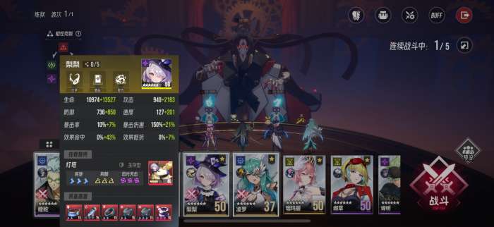 2、想要降低翻车概率就要在boss出手第三回合前结束战斗,也就是需要主c在boss出手第三回合前出手三回合两次大招加一次二技能加梨梨的协战,所以这里上了蝰蛇给boss减速buff,同时蝰蛇的减伤能更好保证队伍状态避免减员