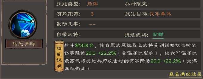 效果:前3回合为我军武/谋最高武将分别减免谋略/兵刃伤害,适合搭配高输出核心(如吕布、关羽)的阵容,提升核心生存能力。