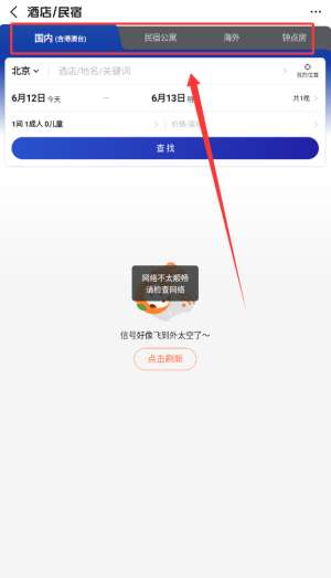 1、首先打开大众点评APP进入首页,点击“酒店/民宿”选项,输入目的地、入住和离店日期后点击搜索。