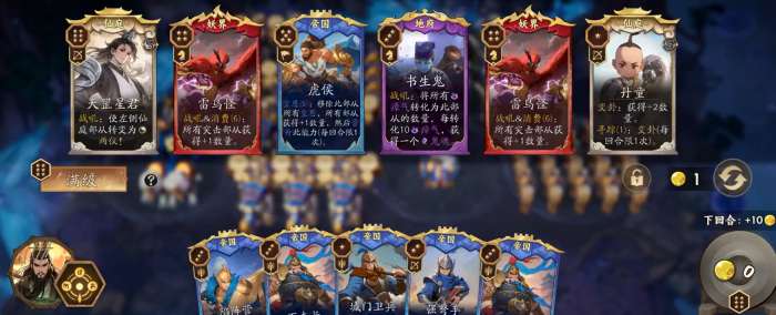 实战运营的关键在于节奏把控。前期需优先推进天书升级进度,确保尽早获取虎侯与紫府老君。在此基础上,应有意识地保留皇恩资源,避免过早耗尽;中期通过始皇帝等辅助角色提升皇恩获取效率(其效果为每张皇恩牌额外提供1点皇恩),从而降低虎侯启动门槛。进入中后期后,集中调度手牌中的皇恩与供能卡牌,在单回合内密集触发虎侯效果,配合紫府老君的次数补正,往往可在一回合内完成6个及以上部从的批量数量增幅,瞬间扭转战场态势。