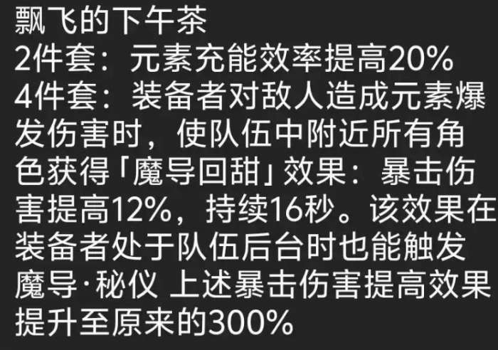 4件套:装备者对敌人造成元素爆发伤害时,使队伍中附近所有角色获得「魔导回甜」效果:暴击伤害提高12%,持续16秒。该效果在装备者处于队伍后台时也能触发魔导·秘仪 上述暴击伤害提高效果提升至原来的300%
