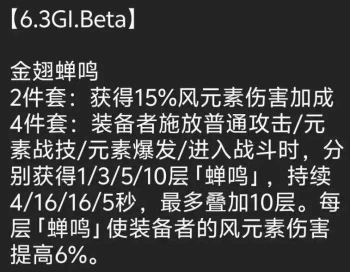 4件套:装备者施放普通攻击/元素战技/元素爆发/进入战斗时,分别获得1/3/5/10层「蝉鸣」,持续4/16/16/5秒,最多叠加10层。每层「蝉鸣」使装备者的风元素伤害提高6%。