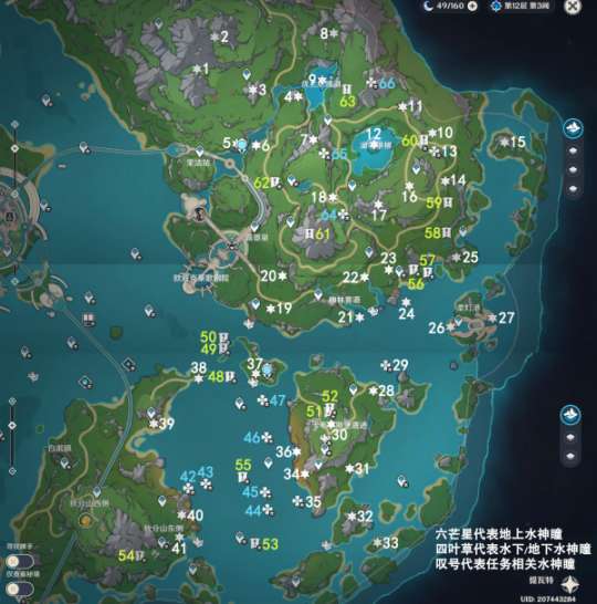 其中地图探索水神瞳50个,任务相关水神瞳16个