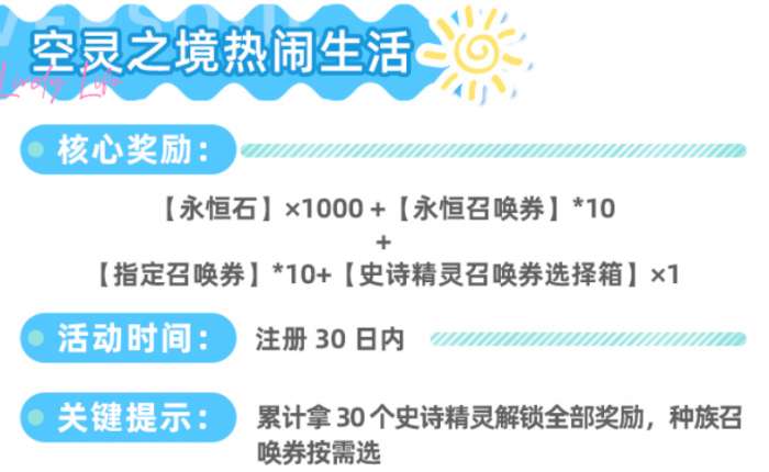 “空灵之境热闹生活”活动限时30天(自注册日起计算),达成累计收集30个史诗精灵的目标后,即可解锁全部奖励,包括1000颗永恒石、10张永恒召唤券、10张指定召唤券及1个史诗精灵召唤券选择箱。该目标在常规推图与日常抽卡节奏下可自然达成,无需额外刷取,奖励结构均衡,兼顾资源、抽卡与定向培养需求,综合价值突出。