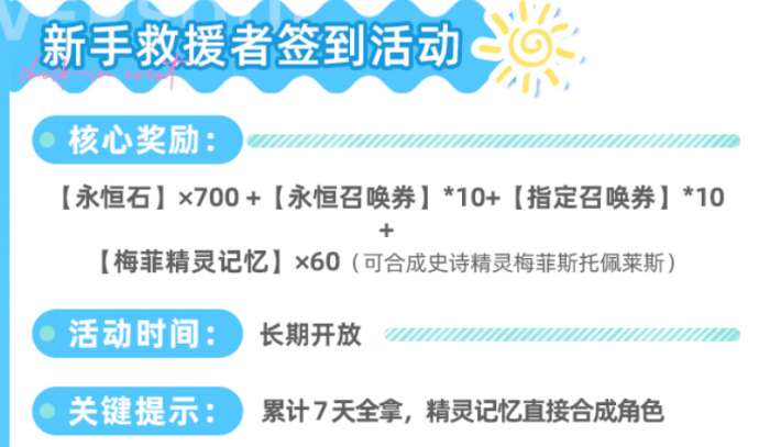 当前开放的双签到机制覆盖不同时间节点:其一是“新手救援者签到”,连续签满7日可获700颗永恒石、10张永恒召唤券及10张指定召唤券;其二是“上线纪念签到”,持续14日,总计发放2400颗永恒石与20张指定召唤券。两项叠加后共得3100颗永恒石,折合约10张永恒召唤券的价值,属于低投入高回报的固定收益来源。