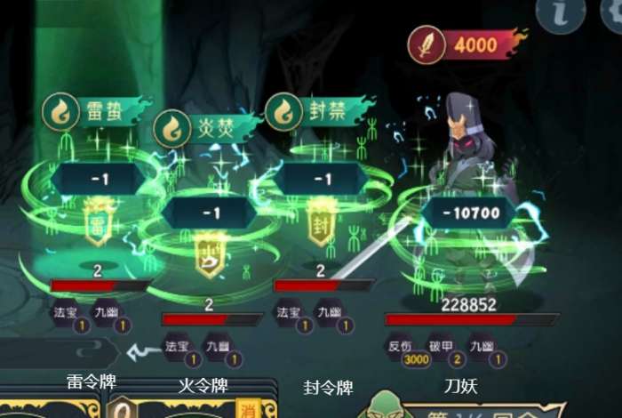 由于反伤是按每次受到的伤害反弹的,同时蓄力会保留,所以今天的打法思路之一是利用高攻击低段数的伤害来尽量少吃到反伤,同时被毒死不会受到反伤,所以今天思路之二就是用水/火攻击清令牌,用毒来毒死刀妖本体。