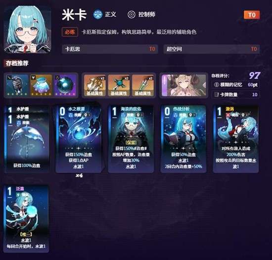 米卡在队伍中担任辅助角色,她的核心卡牌“水之根源”能为队友提供高达150%的治疗并回复Ap点数,配合技能“作战分析”可以实现持续的治疗链。她的治疗技能还能触发特蕾莎的“暗影上膛”,辅助生成更多的暗影匕首。米卡的装备可以选择“森林三叶草”或“恶木的枝条”,这两件装备都能在审判之沼的相关事件中获取,能为自身或队友提供攻击力加成,有效平衡队伍的治疗与输出能力。