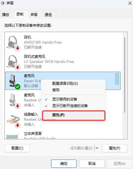 Windows下关闭麦克风的独占模式,在此模式下某些应用程序可能会申请独占使用麦克风导致其他应用无法使用麦克风。具体方法为:控制面板→硬件和声音→声音,在录制选项中找到使用的麦克风设备,右键选择属性
