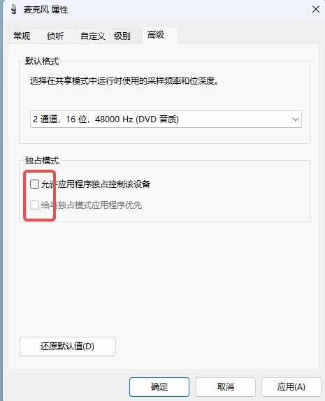 在高级选项中,取消独占模式选项