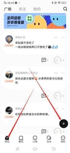 1、进入APP后,首先点击左下方“树洞”,再点击右下方的“+”按钮;