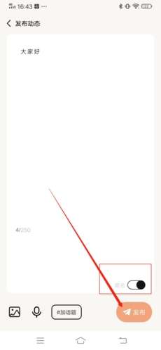2、之后就进入到动态编辑页面了,输入想要分享的动态,点击右下角“发布”就可成功发动态,你还能通过勾选下方的选项来设置是否匿名。