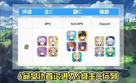 首先是SS级的角色,可以看出甘雨在主C和副C中都进入了SS级, 主C需要1命,副C需要达到2命,值得一提的是,甘雨在主C中的排名超过了卢姥爷排在第一位。
