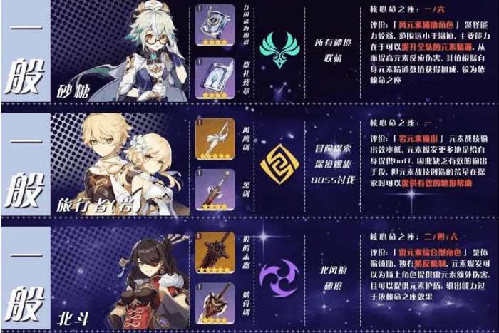 新出现的几个A级角色是主C辛焱、北斗,副C凯亚,辅助安柏和主角。其实北斗作为副C的价值更高,大招的倍率非常高,堪比行秋,但是这份榜单中北斗一直都被列为主C,可能是外服玩北斗的玩家不多,没人去开发。