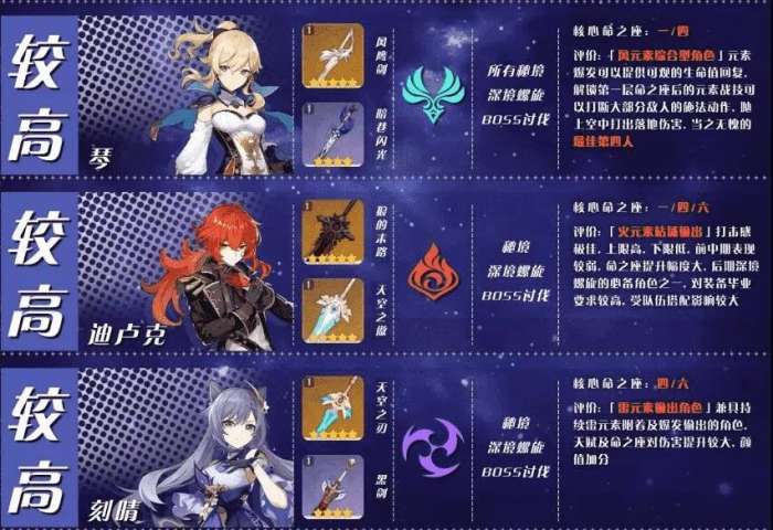 极高:不可替代的,属性高于其他的角色(并不全是五星,注意)