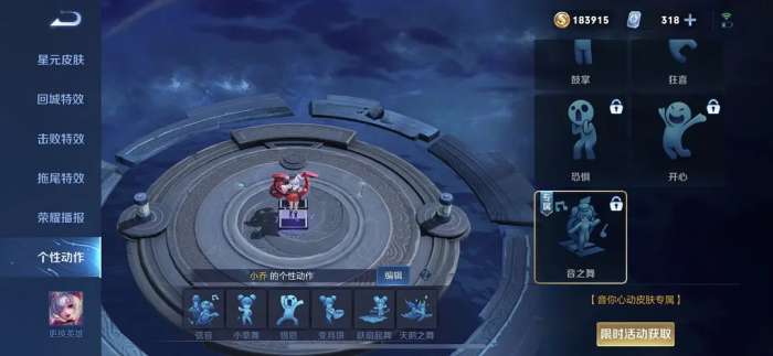 限时活动获取,分享皮肤领取的动作【弦音】【奏雅】已经有很多人领取了,小乔的音之舞动作以及周瑜的舞之音动作都是需要做限时任务才能获得,参与音乐扭蛋机的活动,目前已知的奖励有周瑜—舞之音动作(永久),小乔—音之舞动作(永久),小乔—比芯表情包(永久),活动限时语音—看我表演!活动限时语音—全场节奏我来掌控!