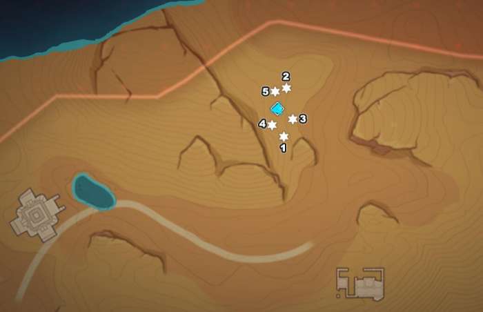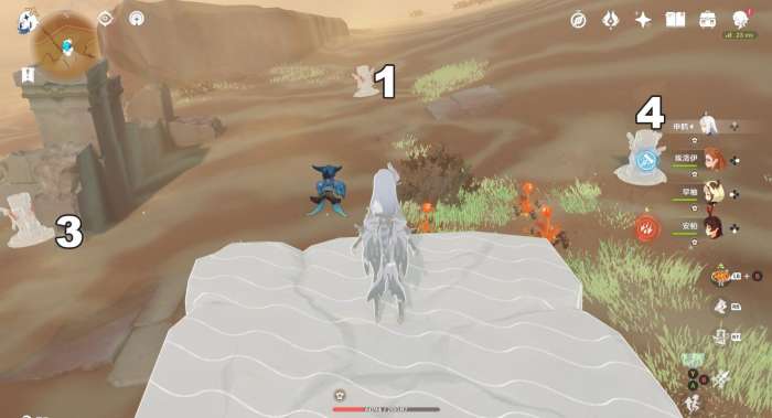 安柏/宵宫爬到荒星/柱子上面 按照5个元素方碑附近烈焰花花蕊的数量提示(从0到4) 点燃方碑