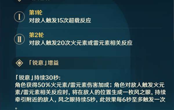 「锐意」增益:buff持续30秒,角色的火元素/雷元素伤害提高50%;角色触发火元素/雷元素相关反应时,会生成一个持续时间5秒的风之眼会持续牵引附近的敌人,风之眼的cd为6秒。