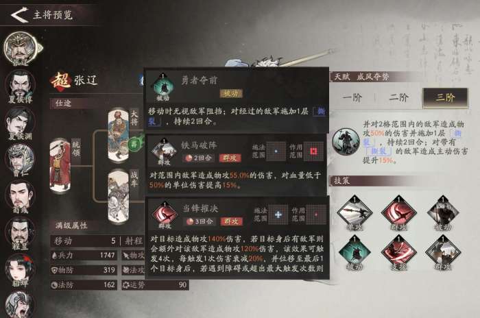 第二梯队可以缓一缓再升,夏侯渊2阶暴击率+15%,弓兵爆发核心,不过三阶暴击回战意实用性真的低。夏侯惇2阶残血能回复32%兵力,没奶妈的时候是刚需,三阶那点提升真没必要急着升。张郃要憋到3阶才发力,全武将克制增伤15%,搭配副将藏霸能叠到20%,后面这个组合打困难图特别好用。