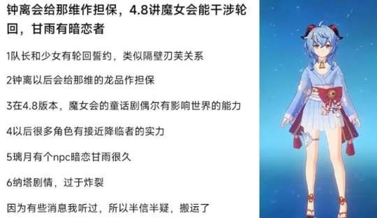 而说起后续版本的剧情相关,舅舅们也爆料了出来,废话不多说,具体大家直接看下图,简单来说就是,从4.8版本的剧情开始,会有魔女会的童话剧,偶尔有影响世界的能力,后续登场的角色实力都拥有接近降临者的实力,并且钟离也会在后续给那维莱特的龙品作担保。