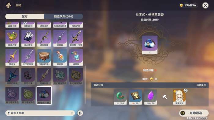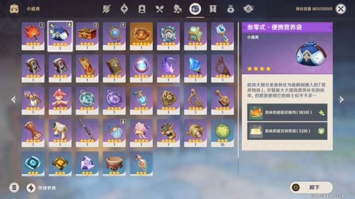 【使用方式】打开背包找到营养袋,如图在右边选择设置需要吃的食物就行,建议甜甜花酿鸡+煎蛋。(不花摩拉,每天探索就能获取,能一直吃到60级)。