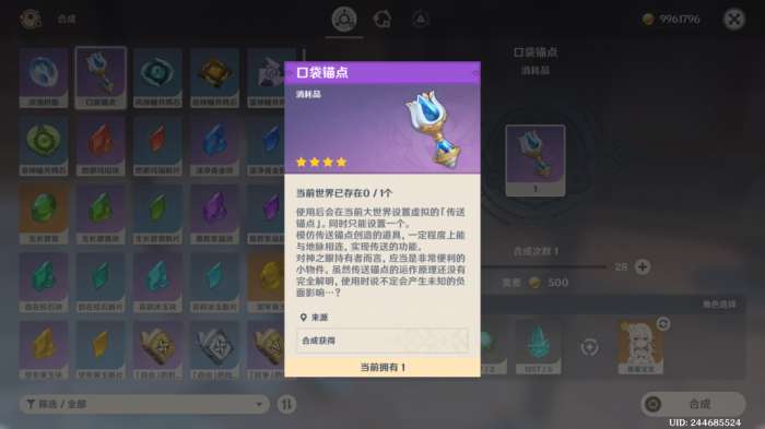 【获取原因】在没有传送锚点的地方,可以自己设置一个口袋锚点直接传送,可以省下跑过去的时间,注意一次只能设置一个,并且是限时10天存在,等第一个消失才能设置下一个。
