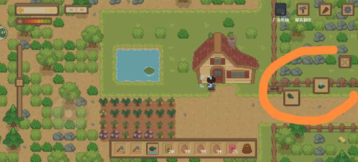 工具栏一个是开垦荒地,一个伐木一个挖矿,前期不要乱用(不想看广告的话),因为有耐久,其次背包有容量限制,只需要开垦空出十几块地种菜就行了,池塘可以补水。
