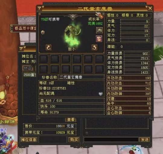 一只名为2513的绿鸟人,没有任何衣着装饰,属于胆小完美状态,售价为1.88万元宝。