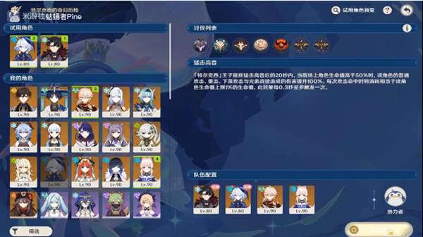 攻略:系统给出的buff是王子施放猛击高歌后,角色生命高于50%时提升普攻(包括重击/下落攻击)和元素战技的伤害,攻击时会少量烧血。明显烧血机制比较符合枫丹体系,试用角色莱欧斯利切合打普攻和战技输出,芙宁娜增伤,整体难度不大,6000分很容易达到。