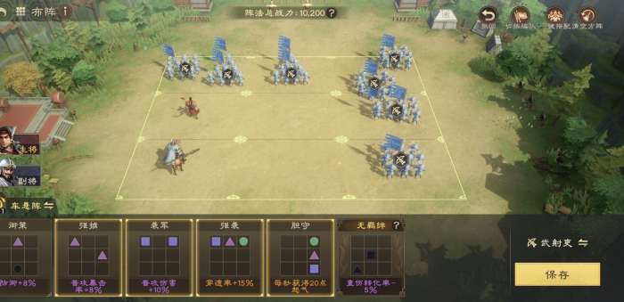 在阵型方面,建议优先选择强掳、强袭、袭军、胆守,增加普攻伤害和暴击数值,强化穿透效果,并持续恢复怒气值,进一步提高部队输出。